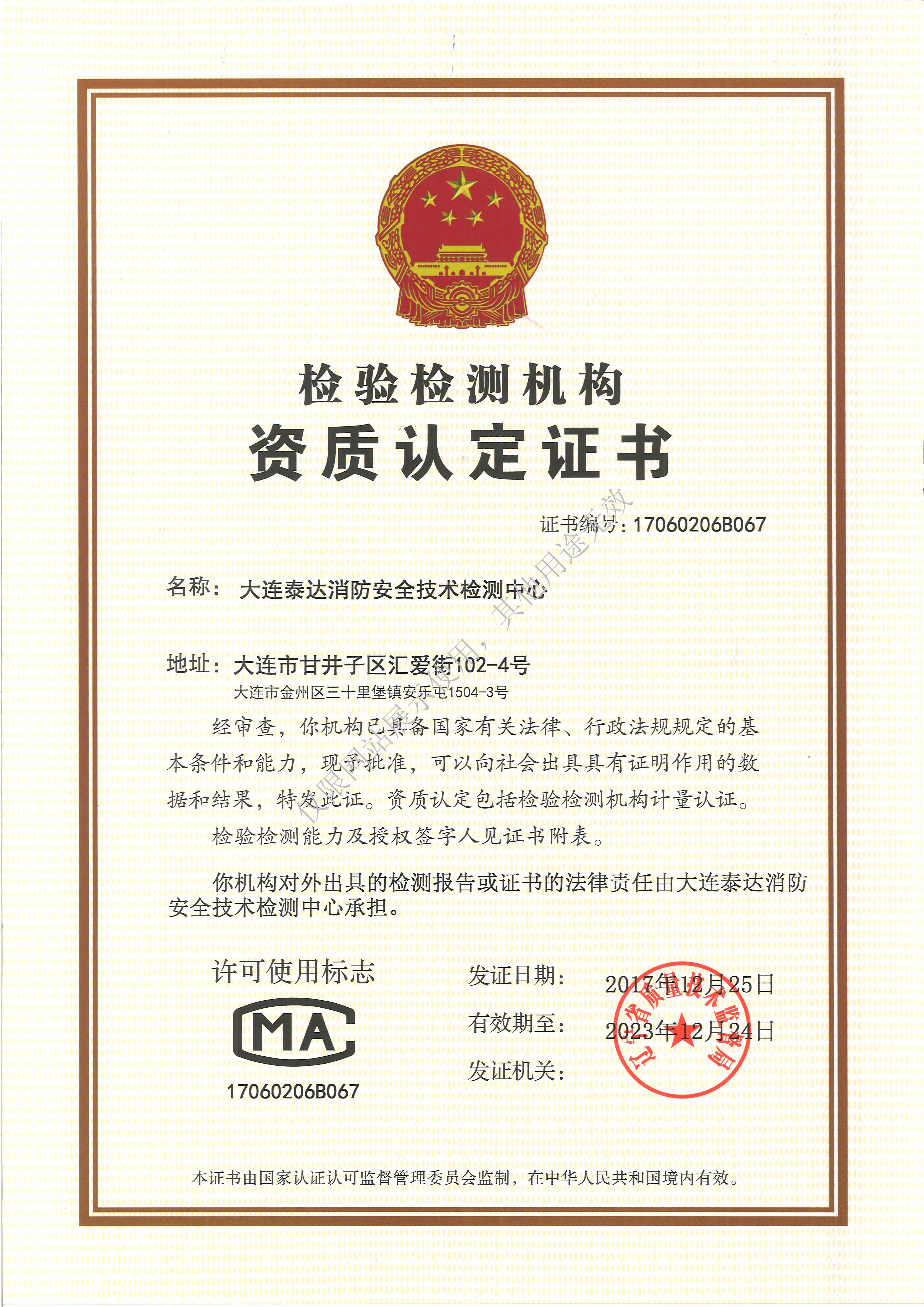 · 是經(jīng)“社會消防技術(shù)服務(wù)信息系統(tǒng)”備案并公示的消防技術(shù)服務(wù)機構(gòu),已取得中國氣象局頒發(fā)的雷電防護裝置檢測資質(zhì)證書、遼寧省質(zhì)量技術(shù)監(jiān)督局審核批準(zhǔn)的檢驗檢測機構(gòu)資質(zhì)認定證書(CMA)及包括消防檢測、電氣檢測、雷電防護裝置檢測、防火涂層厚度檢測等在內(nèi)的200余項檢驗檢測能力,取得大連市應(yīng)急管理局頒發(fā)的安全生產(chǎn)標(biāo)準(zhǔn)化證書,獲得質(zhì)量管理體系、環(huán)境管理體系、職業(yè)健康安全管理體系認證證書,是經(jīng)備案的高新技術(shù)企業(yè),可獨立出具具有證明作用的檢測報告。